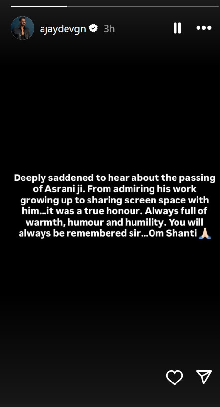अजय देवगन ने भी इंस्टाग्राम स्टोरी पर लिखा- 'असरानी जी के निधन की खबर सुनकर बहुत दुख हुआ. बचपन से ही उनके काम की सराहना करने से लेकर उनके साथ स्क्रीन शेयर करने तक... ये सचमुच एक सम्मान की बात थी. हमेशा गर्मजोशी, हास्य और विनम्रता से भरपूर. आप हमेशा याद रहेंगे सर... ओम शांति.'