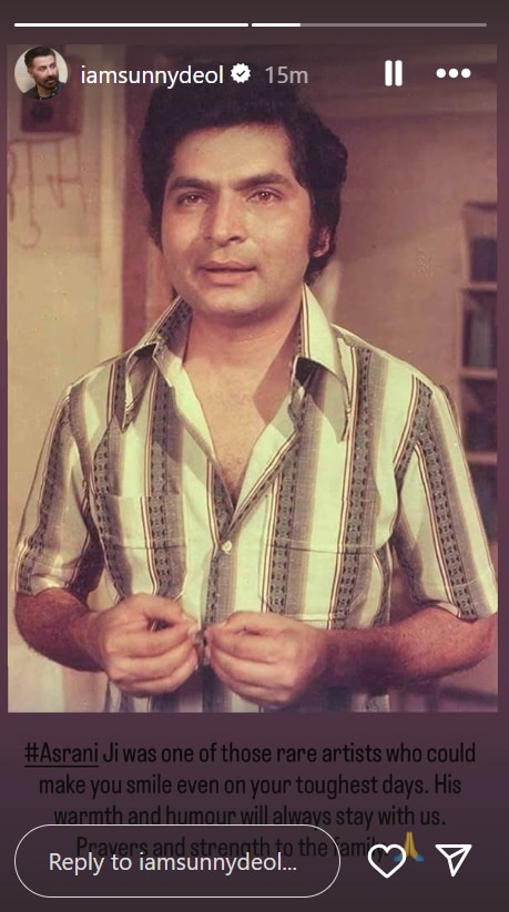 सनी देओल ने इंस्टाग्राम स्टोरी पर पोस्ट करके असरानी के निधन पर शोक जाहिर किया है. उन्होंने लिखा- 'असरानी जी उन दुर्लभ कलाकारों में से एक थे जो आपको सबसे मुश्किल दिनों में भी आपको मुस्कुराने पर मजबूर कर देने का हुनर रखते थे. उनकी गर्मजोशी और हास्य हमेशा हमारे साथ रहेगा.'
