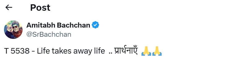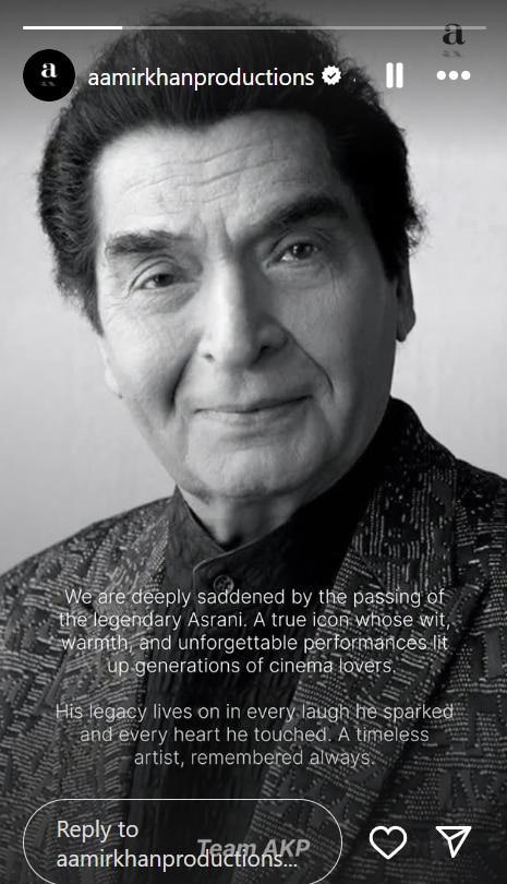 आमिर खान ने लिखा- 'हम दिग्गज असरानी के निधन से बेहद दुखी हैं. एक सच्चे प्रतीक, जिनकी बुद्धि, गर्मजोशी और अविस्मरणीय अभिनय ने सिनेमा प्रेमियों की कई पीढ़ियों को रोशन किया. उनकी विरासत उनकी जगाई गई हर हंसी और उनके छुए हर दिल में जिंदा है. एक कालातीत कलाकार, हमेशा याद किया जाएगा.' वहीं अमिताभ बच्चन ने बिना नाम लिए एक्स पर लिखा- 'जिंदगी छीन लेती है जिंदगी.. प्रार्थनाएं.'