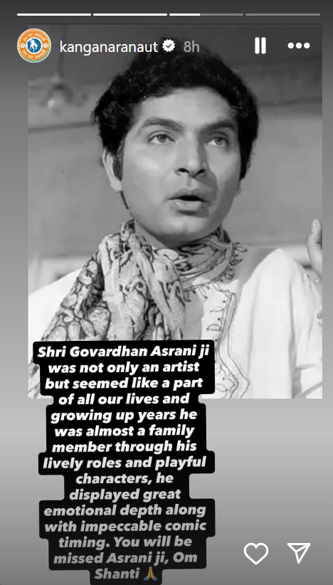 एक्ट्रेस और बीजेपी सांसद कंगना रनौत ने भी इंस्टाग्राम स्टोरी पर असरानी की एक फोटो शेयर की हैं. इसके साथ उन्होंने लिखा- 'श्री गोवर्धन असरानी जी न सिर्फ एक कलाकार थे, बल्कि हम सभी की जिंदगी का हिस्सा भी थे और बड़े होते हुए, अपनी जीवंत भूमिकाओं और चंचल किरदारों के जरिए वो लगभग एक परिवार के सदस्य जैसे थे. उन्होंने बेजोड़ हास्य-व्यंग्य के साथ-साथ गहरी भावनात्मक गहराई भी दिखाई. आप बहुत याद आएंगे असरानी जी, ओम शांति.'