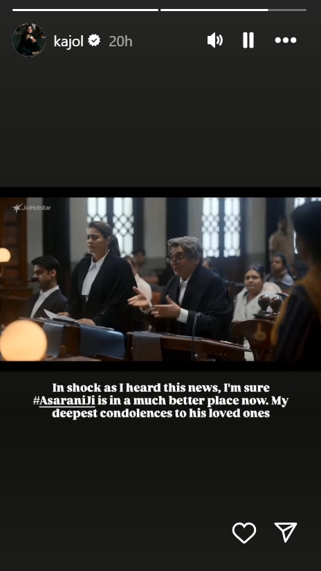 काजोल ने भी अपनी हालिया रिलीज सीरीज 'द ट्रायल 2' से एक क्लिप शेयर की है जिसमें उनके साथ असरानी दिख रहे हैं. इसके साथ एक्ट्रेस ने लिखा- 'ये खबर सुनकर मैं सदमे में हूं, मुझे यकीन है कि असरानी जी अब बेहतर जगह पर हैं. उनके प्रियजनों के लिए मेरी गहरी संवेदनाएं.'