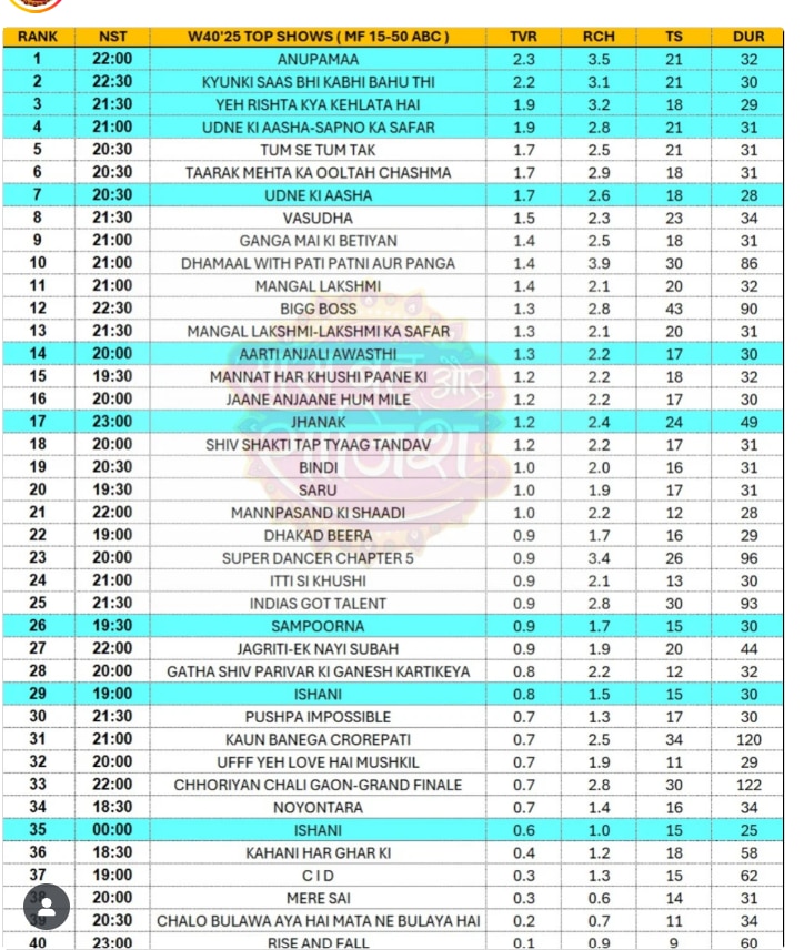 टीवी शोज लवर का इंतजार खत्म हो गया है. 40वें हफ्ते की टीआरपी आ गई है. इस बार टॉप 5 में खास हेर-फेर नहीं दिखा है. हालांकि, रियलिटी शो बिग बॉस 19 और पति पत्नी पंगा की टीआरपी में इजाफा जरुर हुआ है. आइए जानते हैं कौनसा शो किस नंबर पर है.