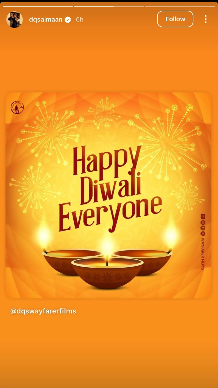तमाम बॉलीवुड सेलिब्रिटीज के साथ–साथ दुलकर सलमान ने भी अपने फैंस को दिवाली की बधाई दी है. अभिनेता ने अपने इंस्टाग्राम के स्टोरीज सेक्शन में दीपों की तस्वीर शेयर करते हुए अपने फैंस को दीपावली की शुभकामनाएं दी है.