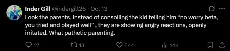 Comments ranged from “Look, the parents, instead of consoling the kid, telling him 'no worry beta, you tried and played well’, they are showing angry reactions, openly irritated. What pathetic parenting.” to “He appears to be confident, but not rude.”